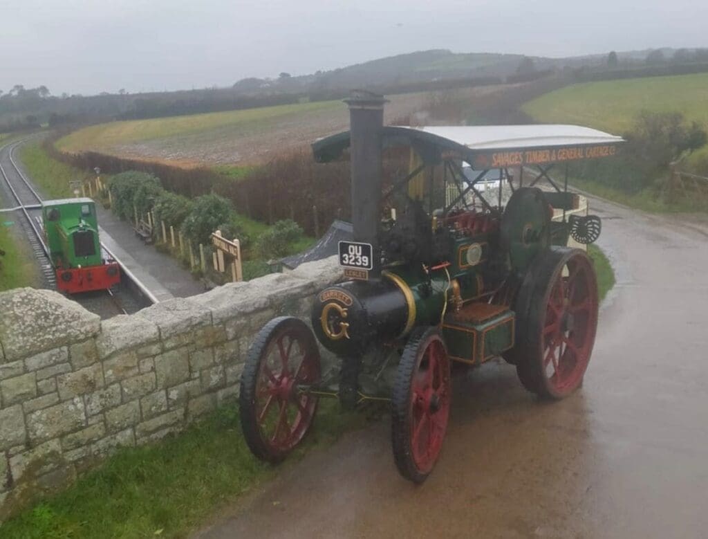 In pouring rain and 486 miles from Darlington, the Helston Railway – the most southerly heritage railway in the UK and the most westerly in England took part in the Whistle-Up with Barclay diesel Kingswood and general manager Colin Savage’s restored 1929-built Garrett 4CD steam tractor sounding off at noon at Truthall Halt. COLIN SAVAGE